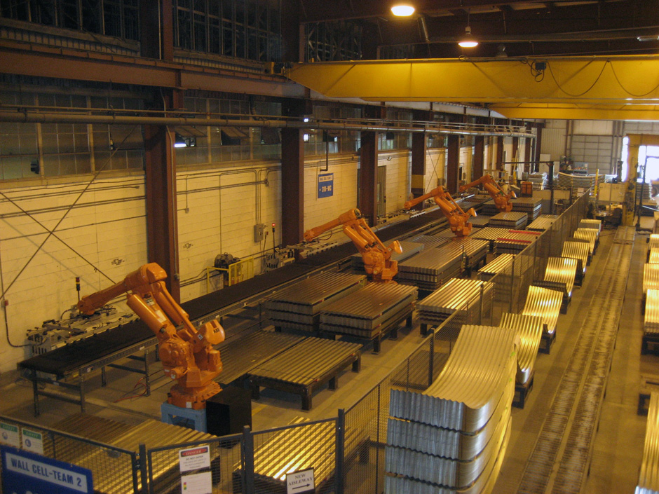 grain bins. The ABB M2000 robots are sequenced to pick up sheets in the correct order with different
