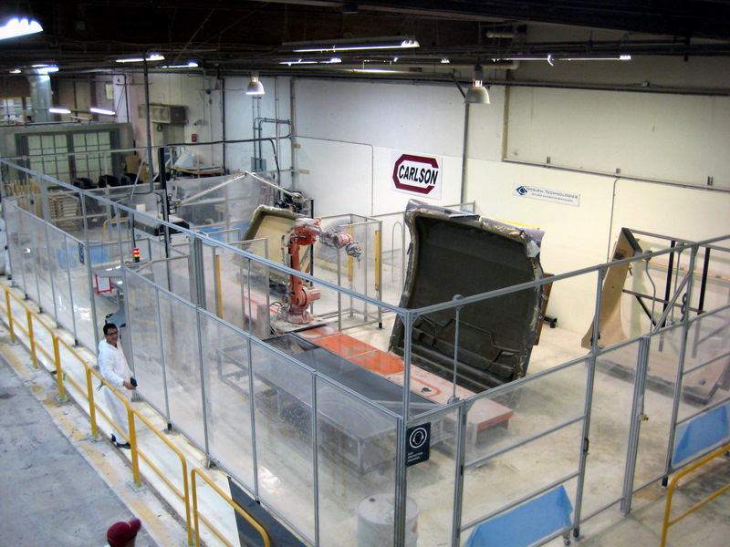 This is a robot cell to trim fiberglass parts using high pressure water jet cutting. The use of an ABB 4400 robot