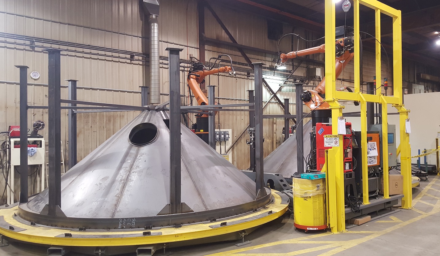 bottom cone section of the grain bins where the legs are to be welded. The rotation of each independent Turn Table is controlled by a large KUKA 6800 MGU