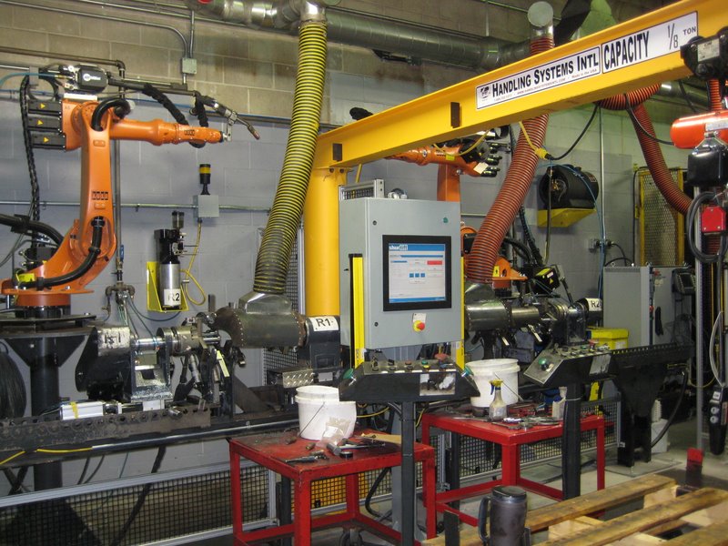 This cell uses two KUKA KR6 robots for welding base plates onto hydraulic cylinders. The use of robotic welding greatly increases part throughput, and keeps the weld quality consistent.